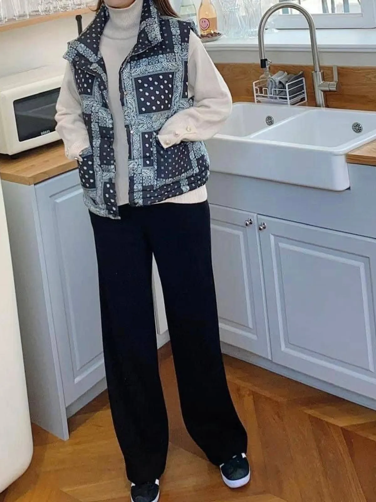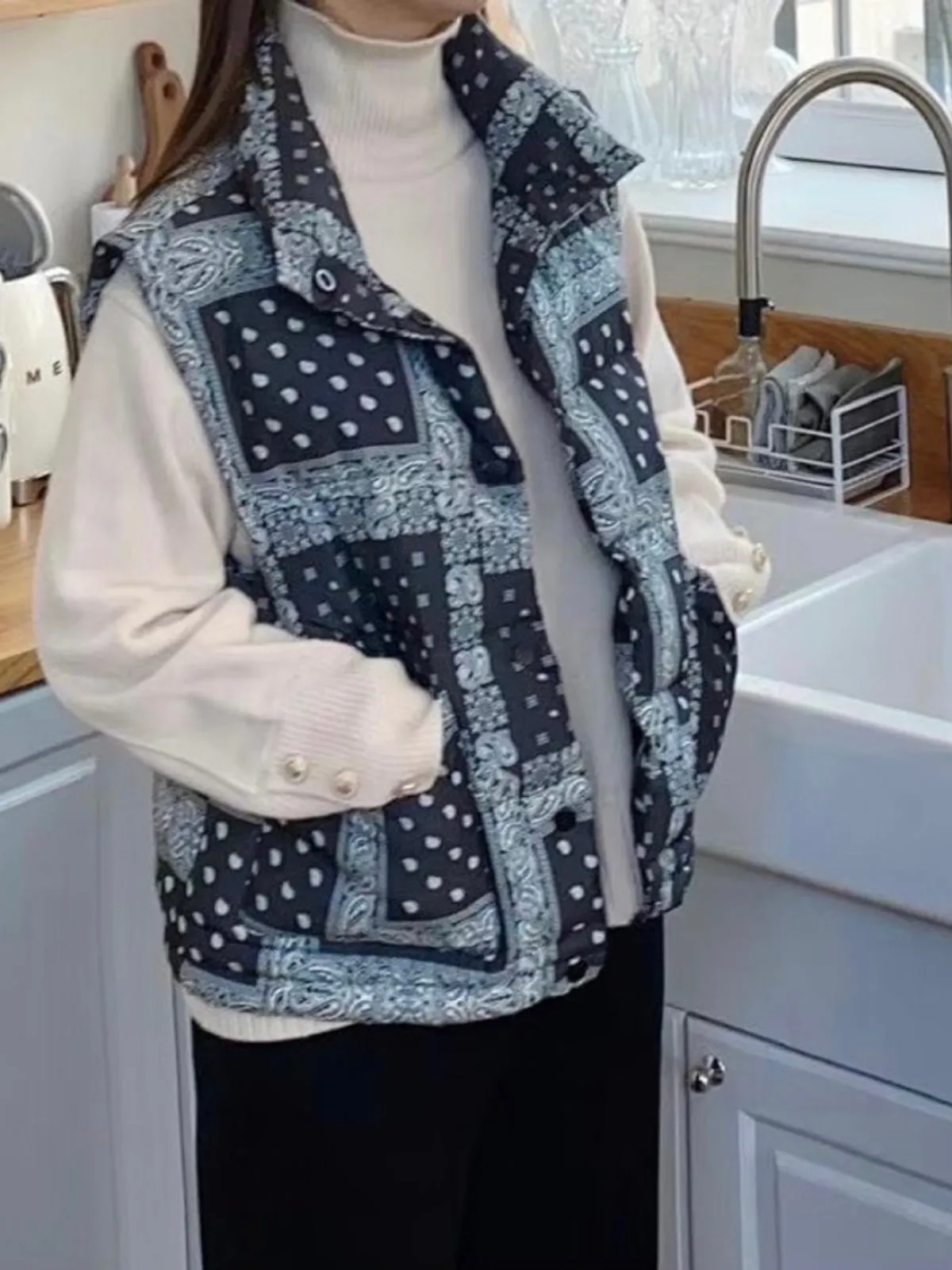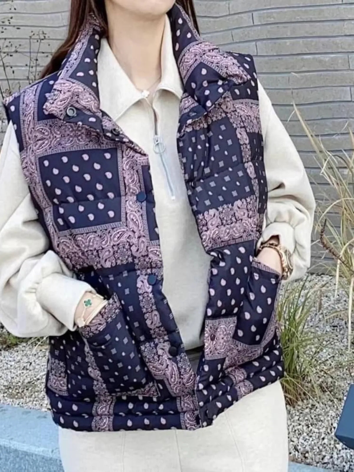 這款拼接羽絨背心,以變形蟲拼接經典Paisley圖騰,帥氣中帶點街頭俏皮感。