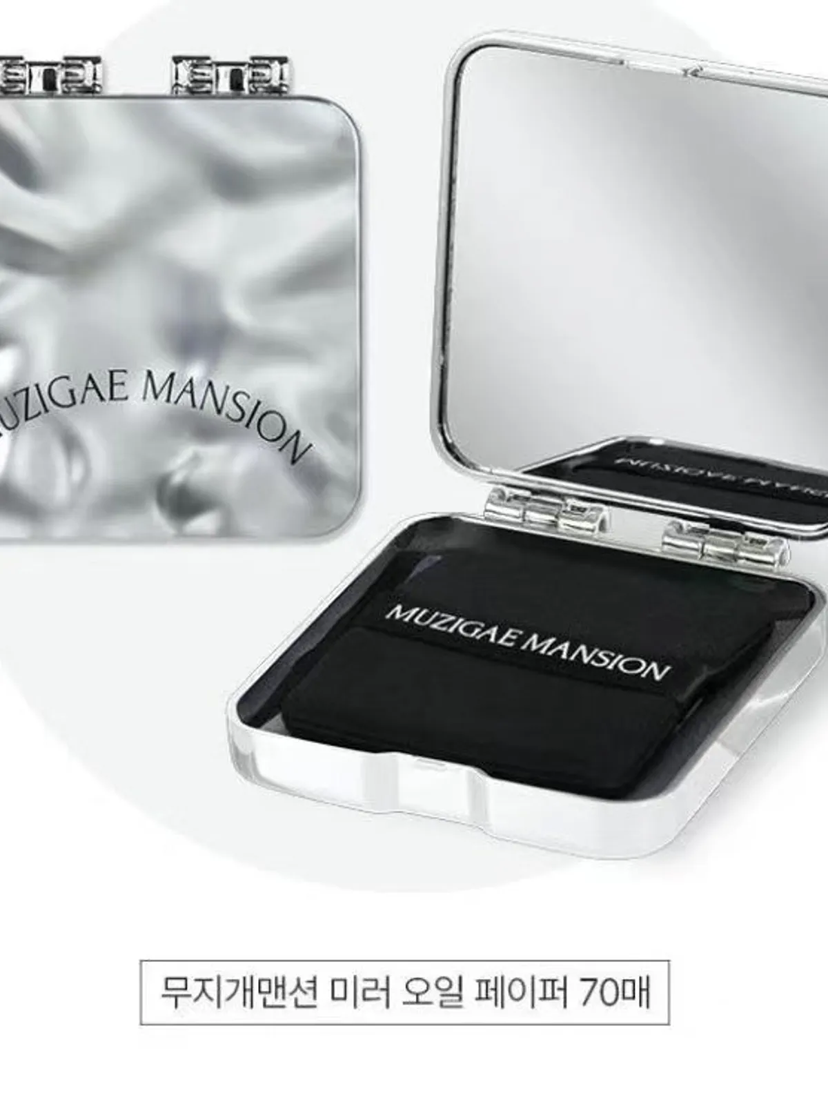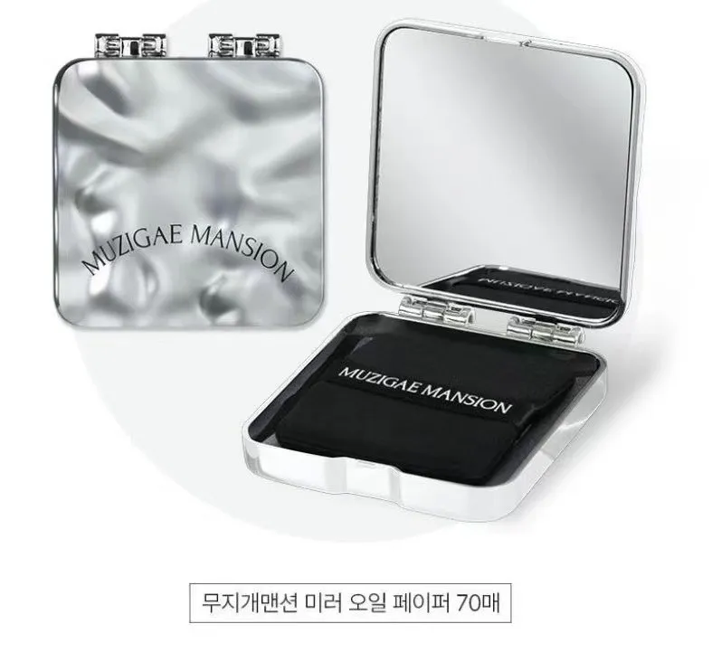 Muzigae Mansion 全新設計感隨身吸油面紙,外盒採用銀白流光壓紋設計,自帶高級感,內附高清鏡面,補妝同時快速吸附多餘油光,保持清爽妝容一整天!